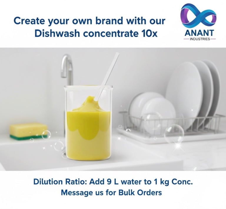 Anant Industries presents the 10x Heavy-Duty Dishwash Concentrate-a high-performance, industrial-grade base designed to tackle the most stubborn burnt-on food, heavy oils, and animal fats. This is the "Gold Standard" for manufacturers supplying the hospitality sector and premium household markets.